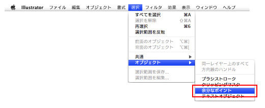 全てのオブジェクトを選択した状態で空白、フォントがない印刷されない点を削除します。[ 選択 ] → [ オブジェクト ] → [ 余分なポイント ]を選択し、削除します。